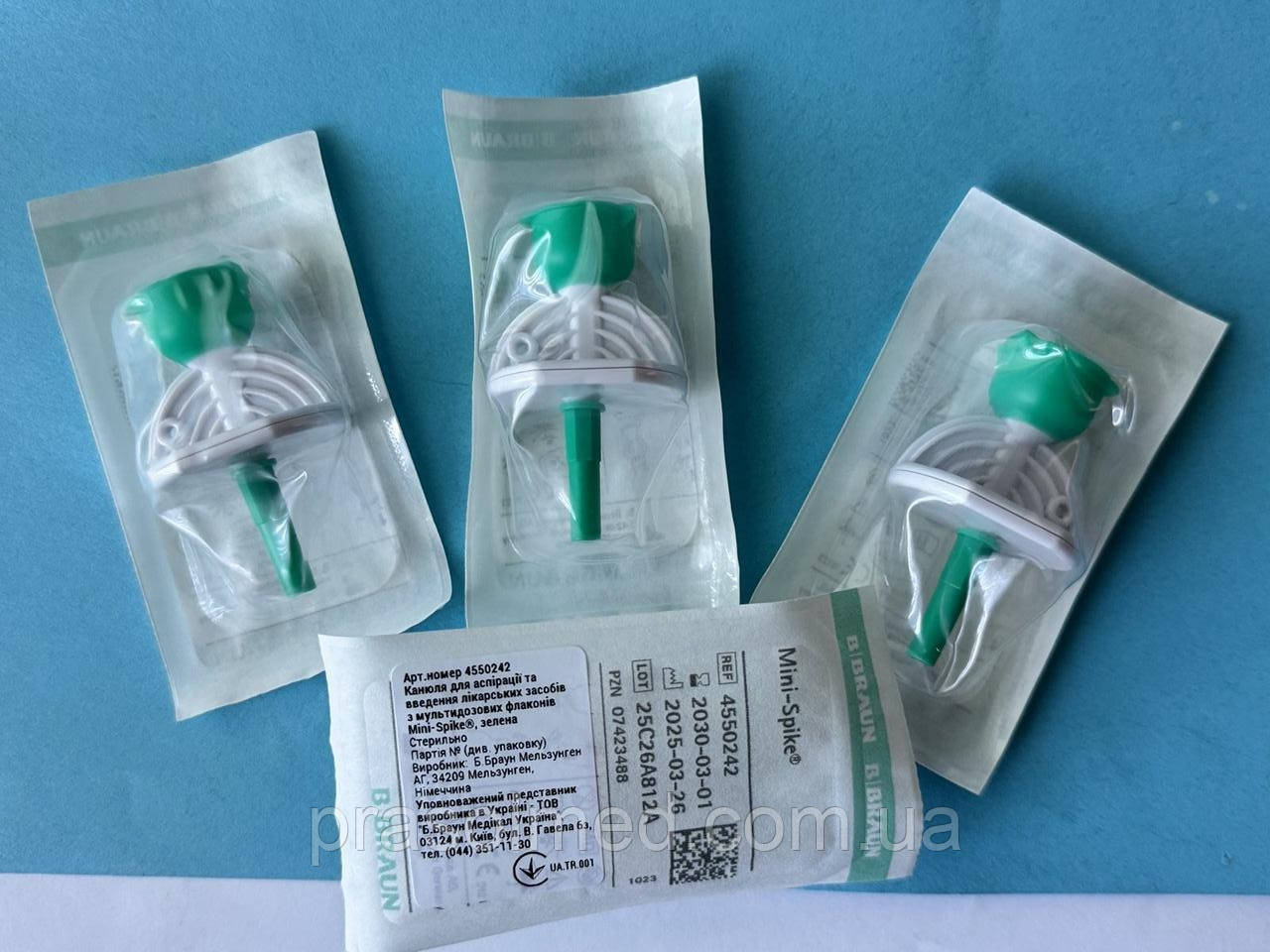 Канюля для аспірації та введення лікарських засобів із мультидозових флаконів B.Braun Mini Spike ® зелена призначена для аспірації та ін'єкції рідин із флаконів або пластикових контейнерів. Безігальний пристрій Міні Спайк дає змогу забезпечити високий рівень безпеки, що проводиться в лікувальній установі інфузійної терапії та підтримувати санітарно-епідеміологічний режим.